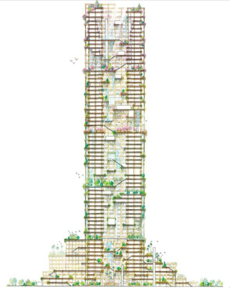 根據「住友林業」在記者會上公布的計畫,整棟大樓將會包含旅館、私人住戶辦公室,而且每一層樓都會有樹木、綠葉穿插其中,也都設有陽台。「住友林業」希望可以透過這樣的設計,「將城市打造成森林」,讓人們就算是在都會區,也能享受「新鮮空氣、穿透葉子的太陽光」等各式各樣的自然元素。