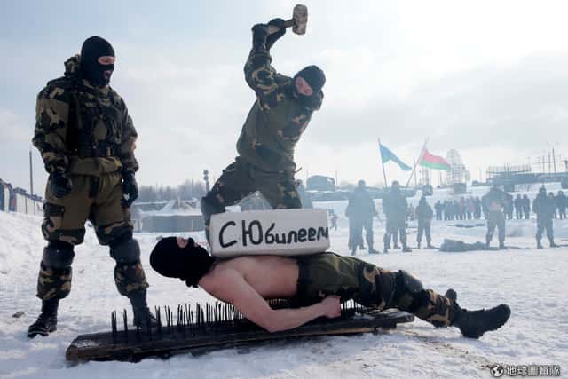 適逢白俄羅斯一年一度的「祖國保衛者日」(Defender of the Fatherland Day),一名軍人脫下軍服躺在釘床上,身上擺著寫有「紀念日快樂」的石塊,準備接受同袍的痛擊來展現強健的體魄。