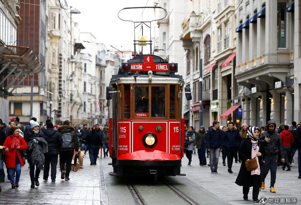 在伊斯坦堡人潮洶湧的獨立大街(İstiklal Avenue)上,一輛鮮紅色的復古電車緩緩駛過。
