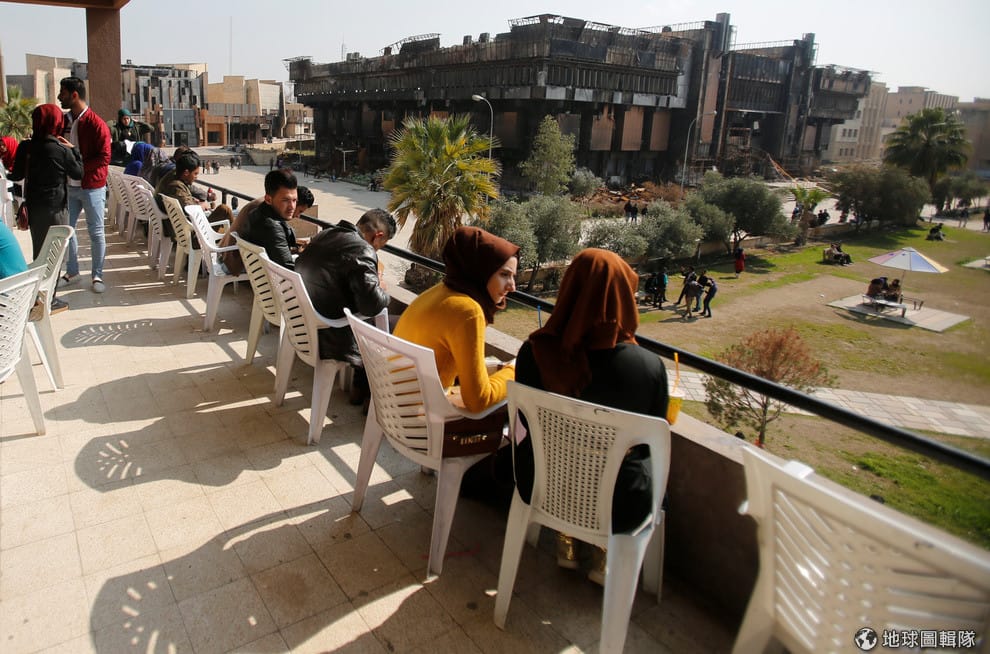 在位於伊拉克北部的摩蘇爾大學(University of Mosul),學生們坐在先前遭到戰火破壞的校園內談天。