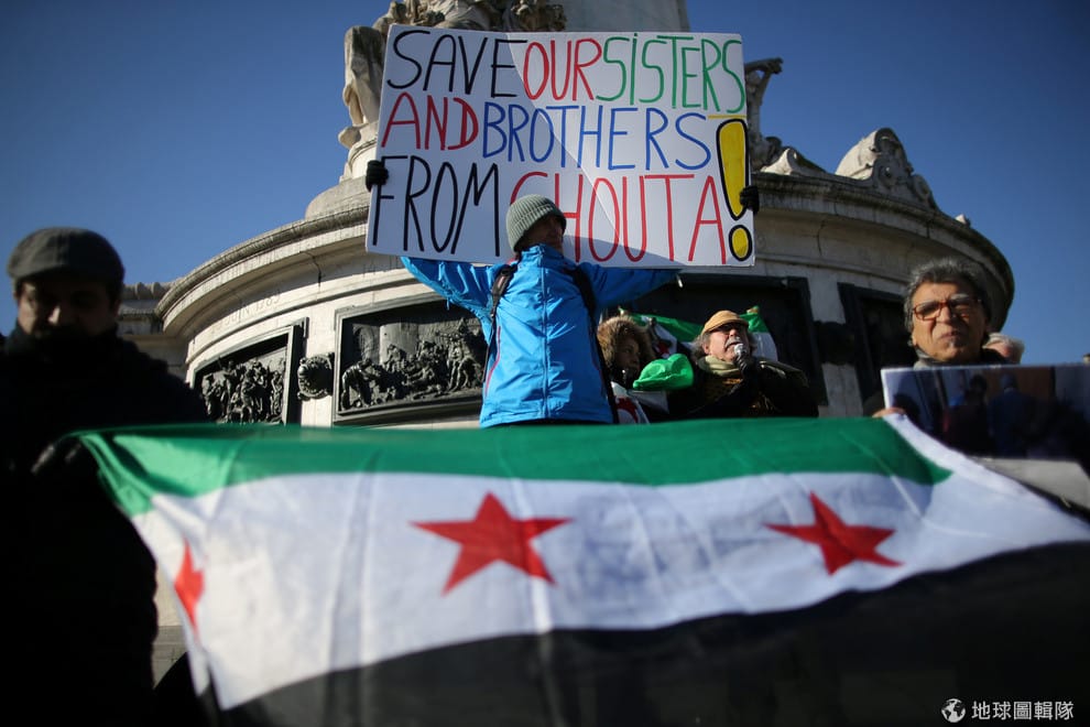 在巴黎,示威民眾手舉著寫有「救救我們來自烏塔區的兄弟姊妹!」字樣的海報,呼籲大眾關注目前被敘利亞政府猛烈空襲的東烏塔區(Eastern Ghouta)。