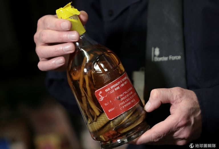 這一罐是用眼鏡蛇製成的藥酒。英國邊境調查員索萬(Jan Sowa)說:「在大多情況,這些東西其實被視為觀光紀念品,而不是因為什麼迫切的藥物需求(而被帶出國)。」