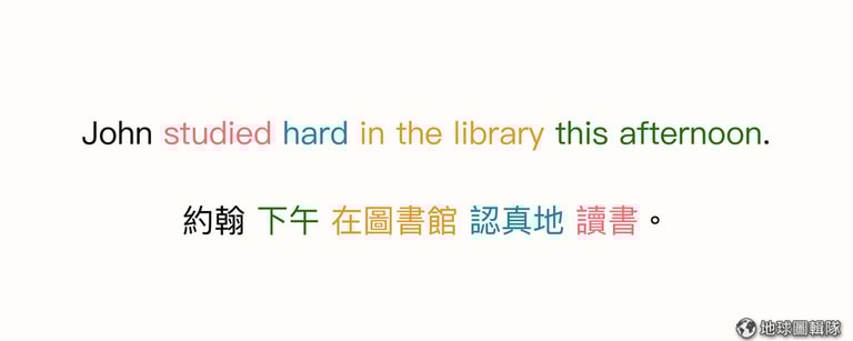 好玩的來了,英文句子中,動詞是領頭走在最前面,所有配角跟在後頭;而中文的句型,卻是先讓配角們出場,核心的動詞在最後壓軸。