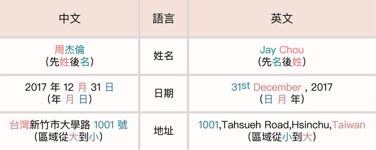 這種基本「中心語在前」或是「中心語在後」的規則差異,就能夠用來解釋姓名、日期、和地址在中英文裡的相反順序了。