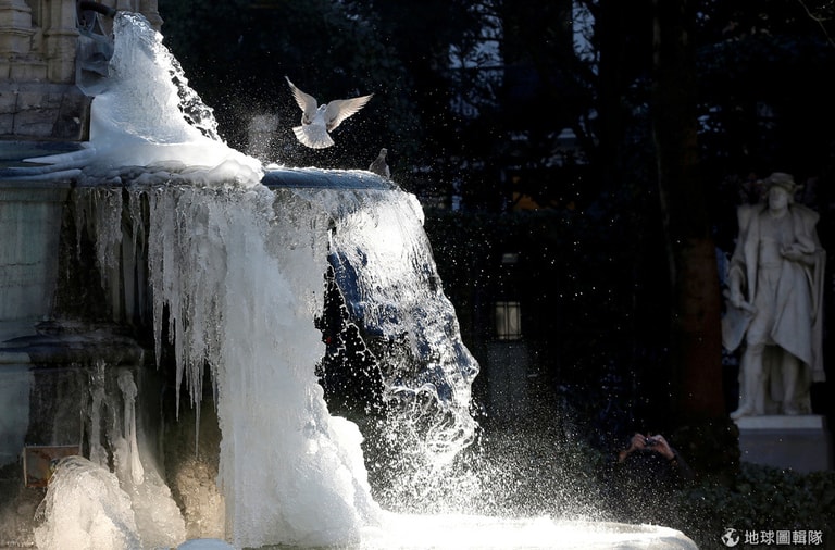 受到被稱為「東方野獸」的俄羅斯北極冷鋒的影響,首都布魯塞爾市區的噴泉都結成冰,讓想停下來稍作休息的鴿子無處可依。