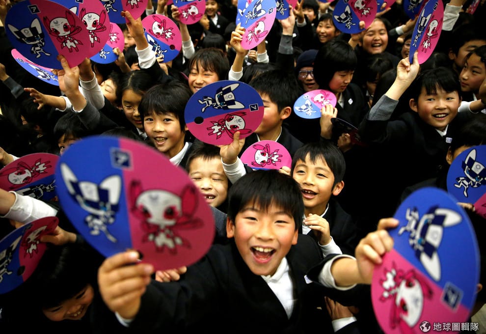 28號這天,一群小學生拿著印有 2020東京奧運吉祥物的紙扇,開心地向攝影師秀出他們投票選出的吉祥物,這組雀屏中選的吉祥物結合了對未來的想像以及代表日本傳統的市松圖案,反映了日本的過去與未來。