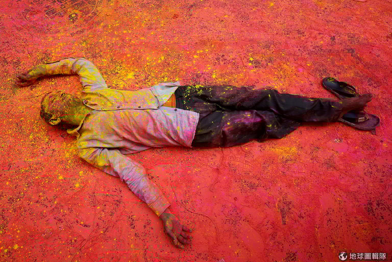在加爾各答(Kolkata)的街頭,一名男子躺在被彩粉染得五顏六色的大街上休息,準備待會起身參加色彩節(Holi)的遊行。