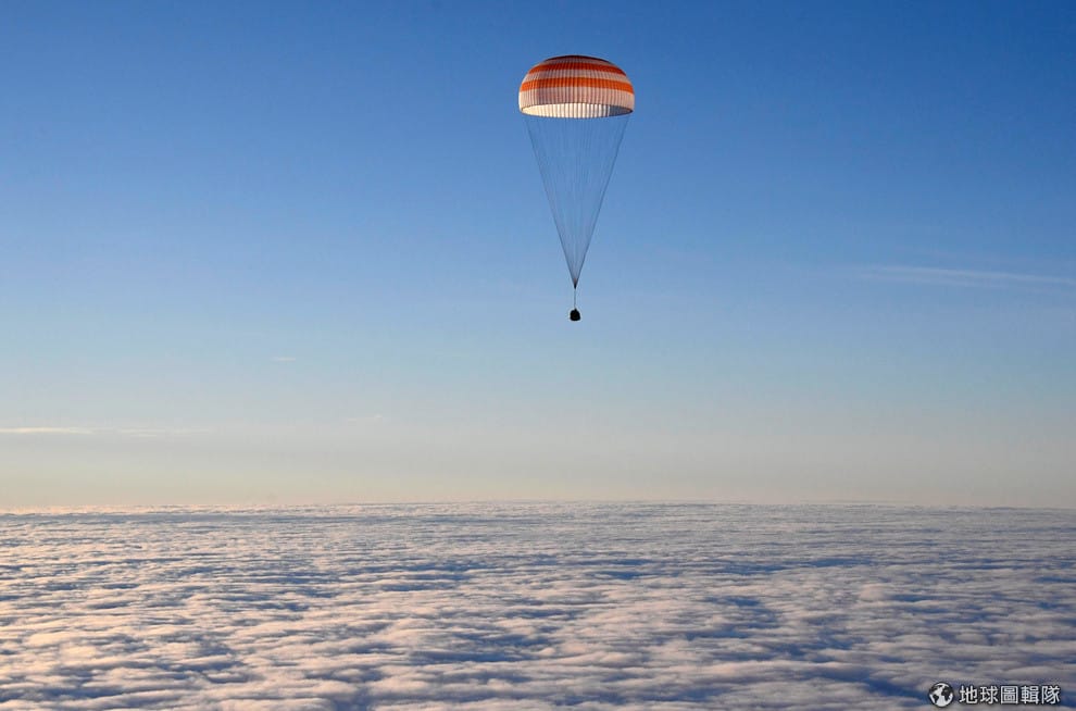 在中部城市傑茲卡茲甘(Dzhezkazgan)的上空,一頂繫著聯盟(Soyuz)MS-06太空船的降落傘緩緩下降,準備帶著三名執行完宇宙任務的太空人回到陸地。