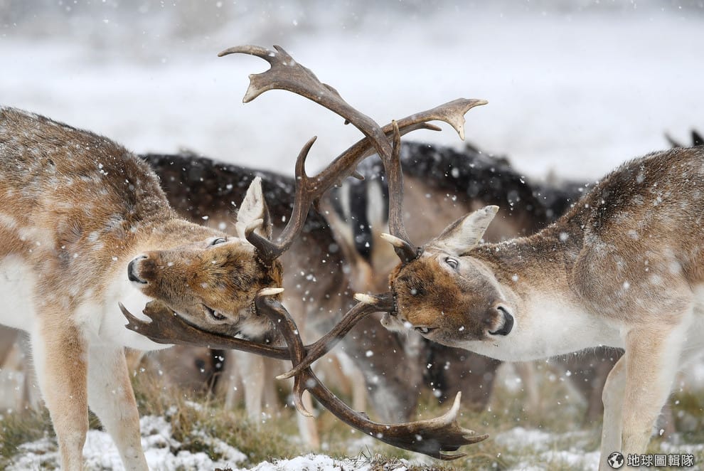 在冰天雪地的倫敦里奇蒙公園(Richmond Park)內,兩隻公鹿用鹿角測試對方的底線。