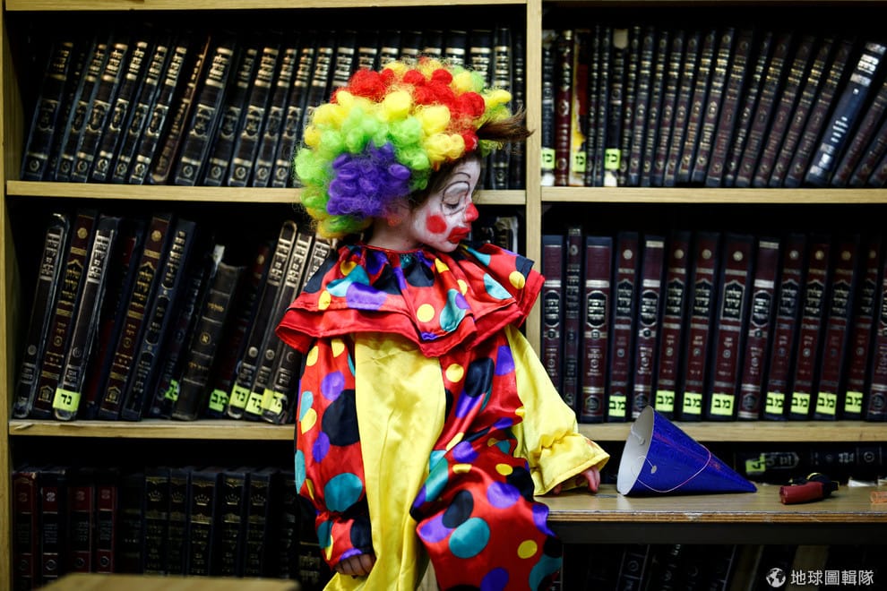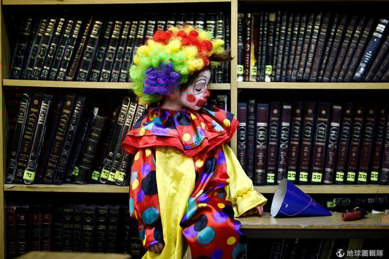 在猶太普珥節(Purim)的紀念儀式上,一名猶太正教的小男孩打扮成一名小丑讀著猶太教經典《以斯帖記》(the Book of Esther)。根據《維基百科》的資料,對猶太人來說,普珥節是紀念他們沒有被滅族的重要節日之一。