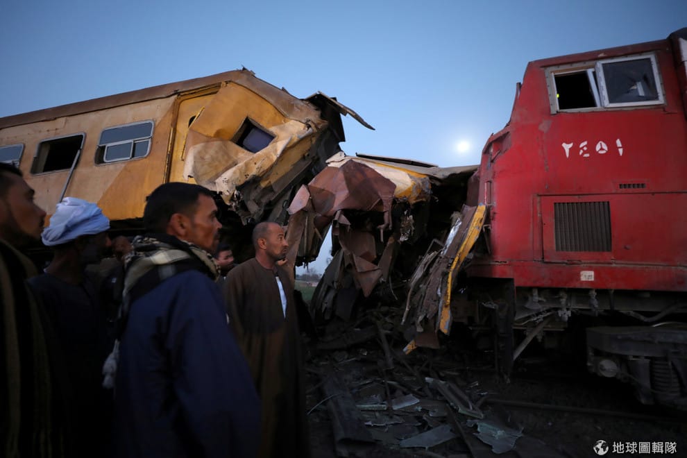 在埃及北方的布海拉省(Beheira),搜救人員看著眼前對撞的火車殘骸,這起對撞事故至少造成 15人死亡、40多人受傷。