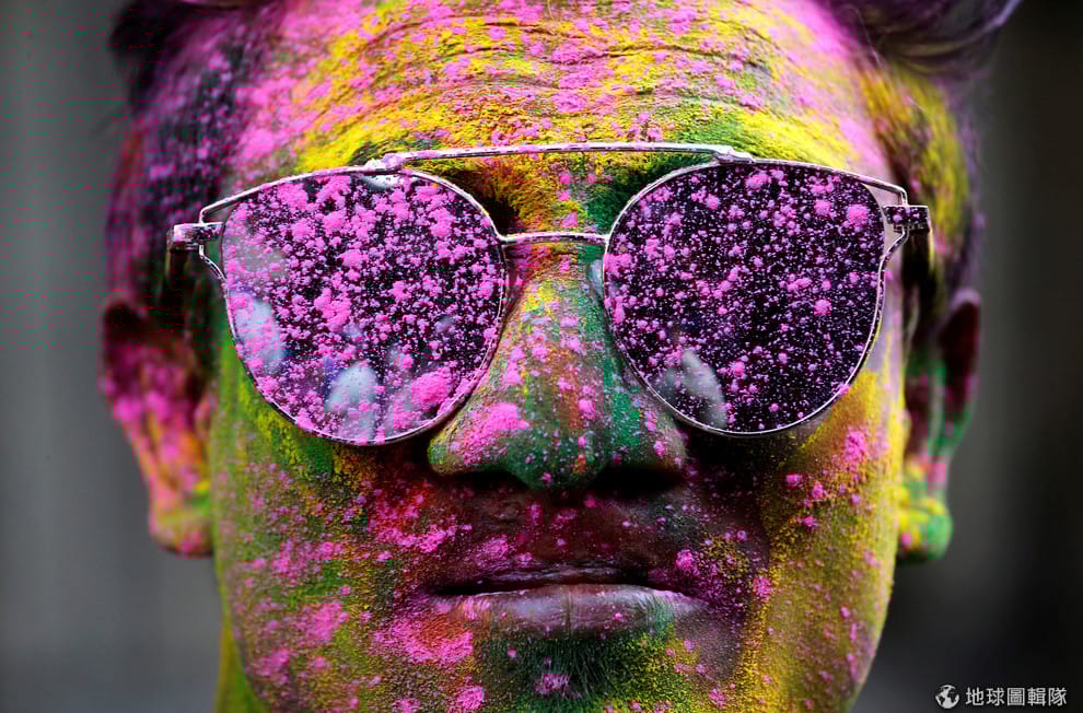在加爾各答(Kolkata)街頭,一名滿臉沾滿彩粉的男子看向鏡頭,歡慶色彩節(Holi)的到來。