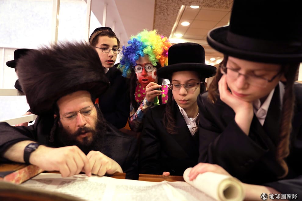 在猶太普珥節(Purim)的紀念儀式上,信奉猶太正教的少年跟著拉比一起讀猶太教經典《以斯帖記》(the Book of Esther),其中有名男孩打扮成了小丑的樣子。根據《維基百科》的資料,對猶太人來說,普珥節是紀念他們沒有被滅族的重要節日之一。
