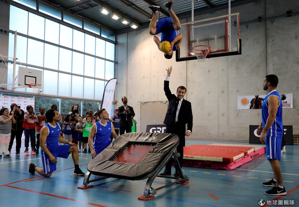 在巴黎北部的維爾塔納斯鎮(Villetaneuse)的一間體育館內,法國總統馬克宏(Emmanuel Macron)和球員們一起打籃球。