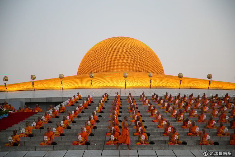 1號這天,信奉佛教的僧侶來到位於曼谷北方的法身寺(Wat Phra Dhammkaya)參加萬佛節(Makha Bucha Day)儀式,只見他們整齊地坐在法身寺的黃金紀念塔前打坐。