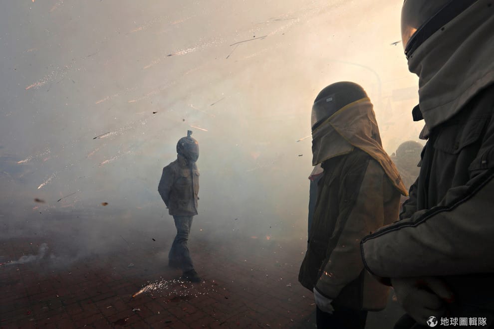 台灣─戴著安全帽躲蜂炮