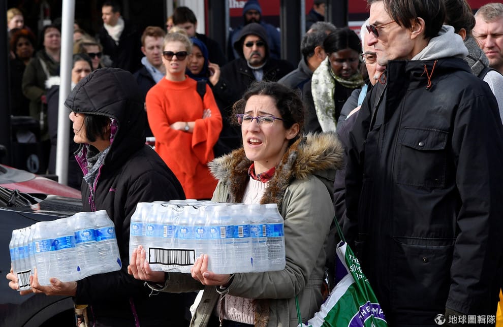 人們正在領取泰晤士水務公司發放的保特瓶水,這裡的水源因為糟糕的天氣暫時停起供應。