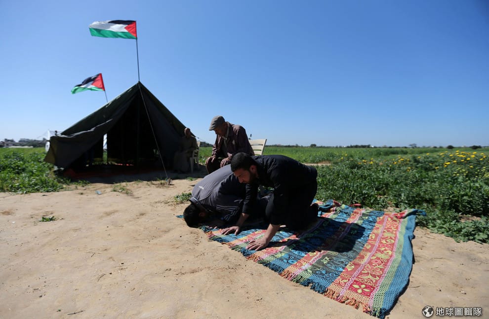 7號,已經在邊境搭好帳篷的巴勒斯坦人正在禮拜。這個月底,巴勒斯坦人打算要在兩國邊境之間打造一個為期六周的「帳篷城市」,來向以色列表達抗議。