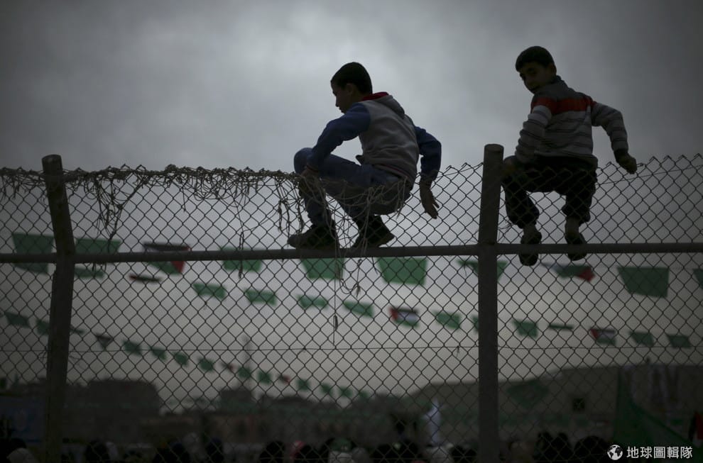 2016年1月,在加薩南部的汗尤尼斯,兩名巴勒斯坦男孩坐在邊境圍籬上。