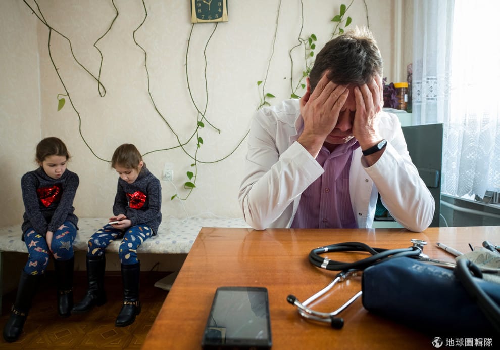 在烏克蘭村莊Ivankovichy的小診所內,醫生羅茲米(Dmitriy Rozumiy)準備要替畫面左方的病人看診。羅茲米表示,現今烏克蘭政府提供的保健體系沒辦法提供鄉村地區足夠的醫療資源,以他自己的診所來說,他不僅缺乏基本藥品,甚至還在使用前蘇聯留下的醫療設備。