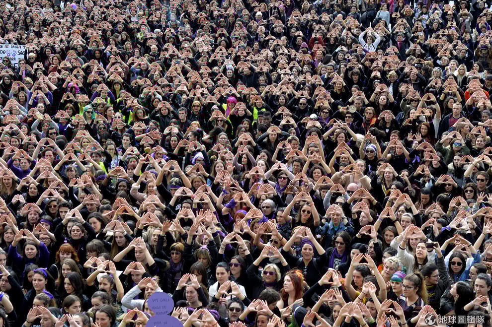 在西班牙北部的沿海城市畢爾包(Bilbao),走上街頭的人們比出三角形的手勢,一同替女性權益發聲。在 38婦女節這天,有數十萬名西班牙人響應 24小時大罷工抗議活動。