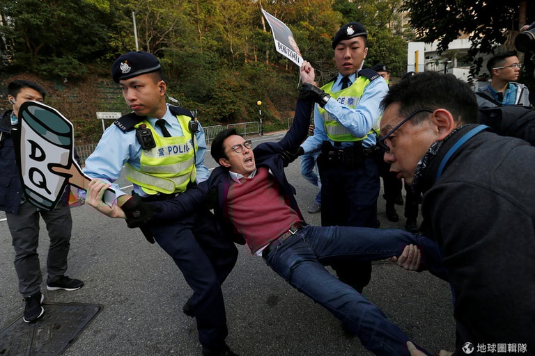 在香港立法會補選現場,數名警察在香港特首林鄭月娥來此投票前,一把抬走了泛民主派的示威者,這名示威者不滿在補選前,多名報名參選者因為主張「港獨」、「民主自決」而被取消參選資格。