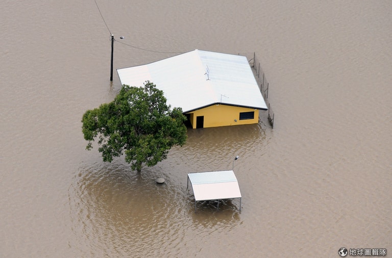 澳洲北昆士蘭的城鎮發生嚴重水災,本來是大門的地方已經不見蹤影。