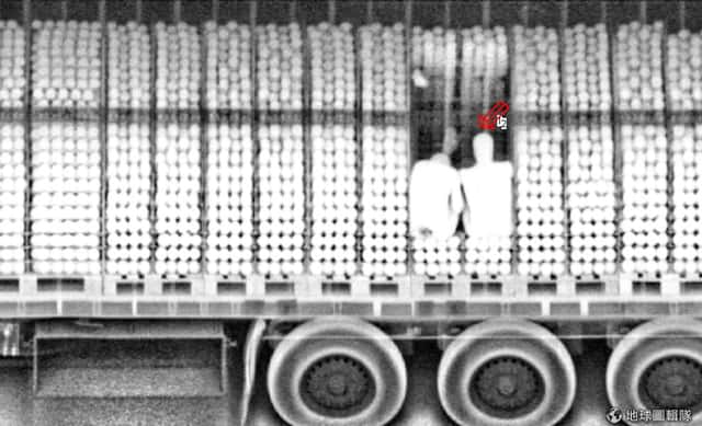 在這張由希臘海岸警衛隊提供的照片中,顯示在X光掃描下,有兩名移民試圖躲在卡車後車廂,藉此從希臘偷渡到義大利。這裡是希臘港口城市帕特雷(Patras),在這裡,警衛隊可說天天和移民進行著貓捉老鼠的攻防。
