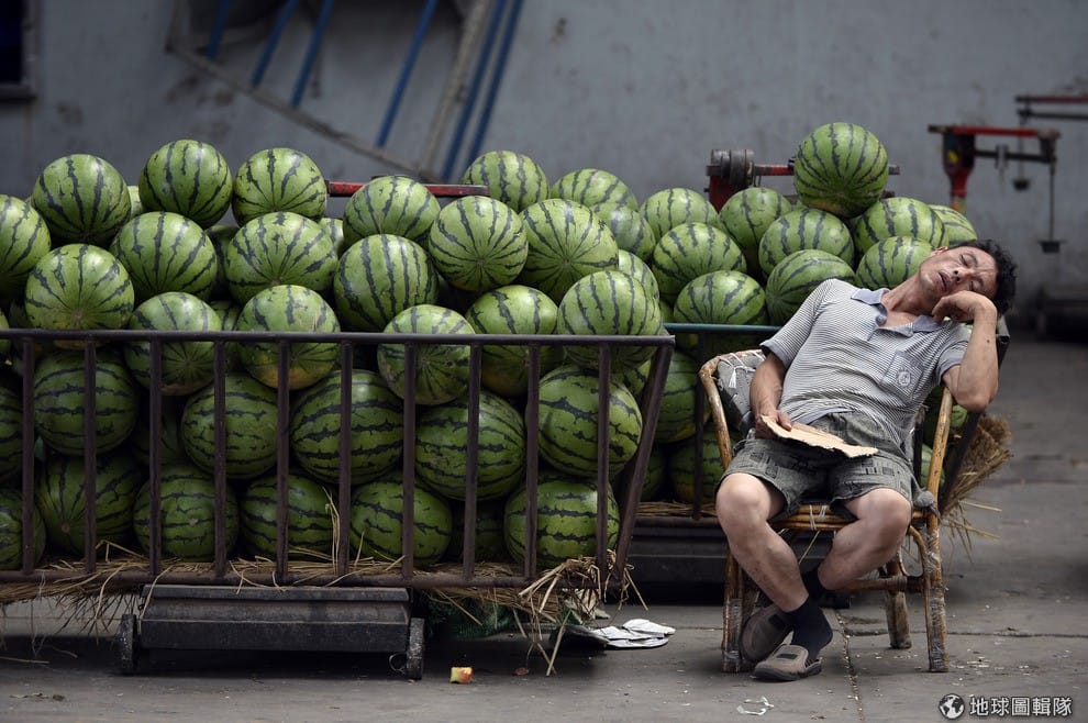 陝西太原市內的市場,等客人上門的西瓜小販,就這樣等著等著做夢去了。