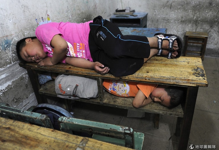 安徽省合肥的一所小學教室內,跟著爸爸媽媽來到城市找打工的小朋友,累得直接在桌上睡大覺。