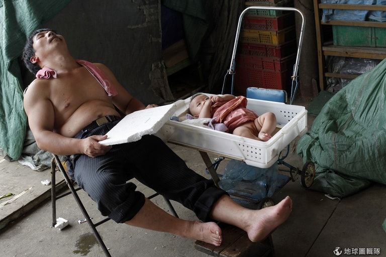 工作告一段落,在小女兒旁邊打盹的爸爸睡的嘴都大張,一旁的妹妹倒是相當有精神。