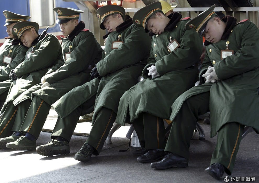 上午因為疏通大量人潮而耗盡力氣的警衛兵,趁著休息時間全排排坐地在椅子上整齊地打起盹來。