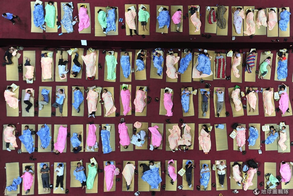 武漢當地的師範大學體育館內,躺滿陪著大一新生報到的爸爸媽媽,校方為這些舟車勞頓的爸爸媽媽們準備了可以席地而睡的地毯。約有600位父母就這樣累得在體育館內呼呼大睡。