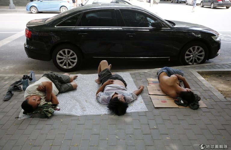 北京市內的馬路旁,來到大城打工的臨時工人趁天還沒太熱先打個小盹。