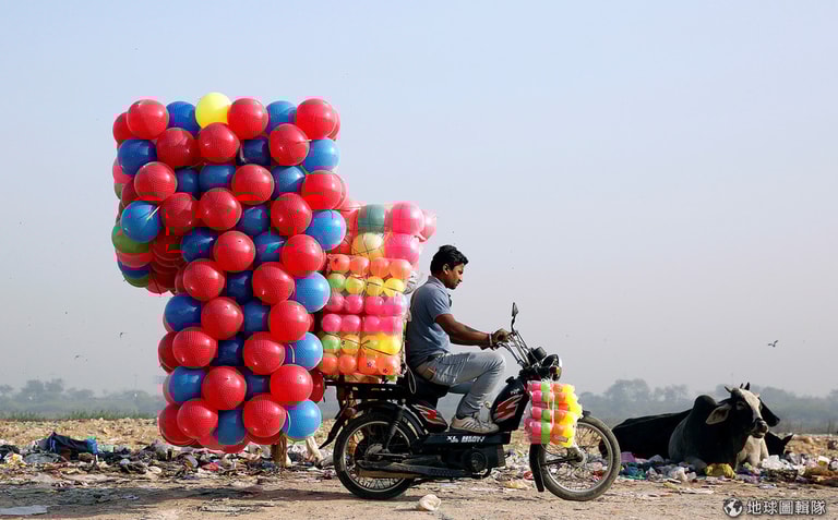 在德里,一名男子騎著載著五彩繽紛的塑膠球,準備拿到市場上去賣。