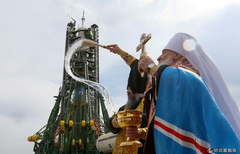 在拜科努爾太空發射場(Baikonur Cosmodrome),一名東正教神父在發射台前潑灑聖水,為即將前往國際太空站(International Space Station)的聯合號(Soyuz)太空船祈福。