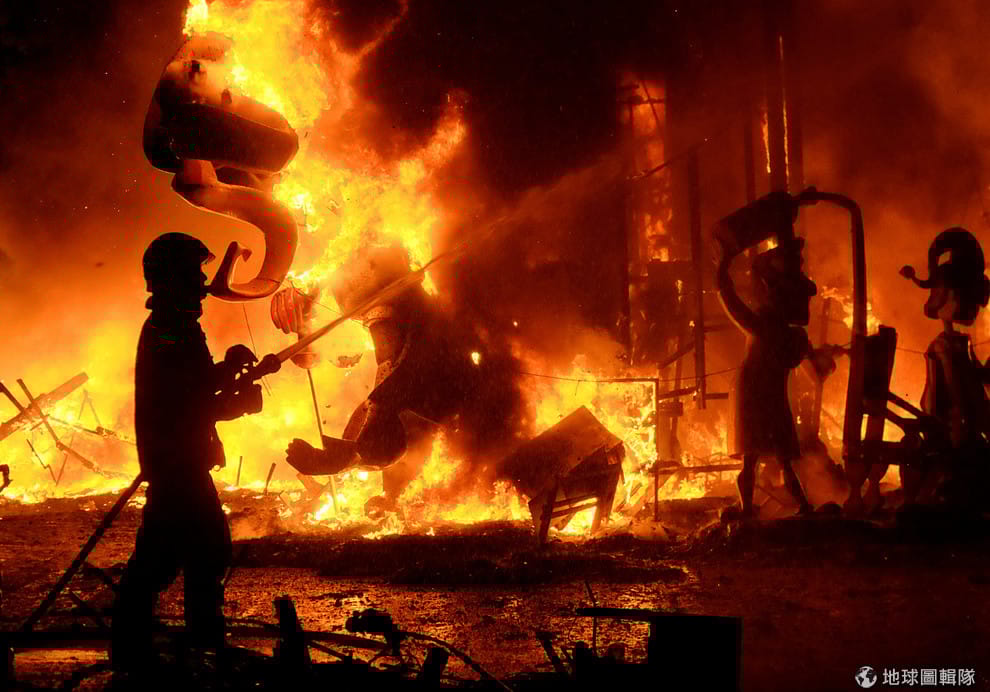 在象徵迎接春天的瓦倫西亞火節(Fallas festival)上,消防人員忙著撲滅燒燬人偶的大火。