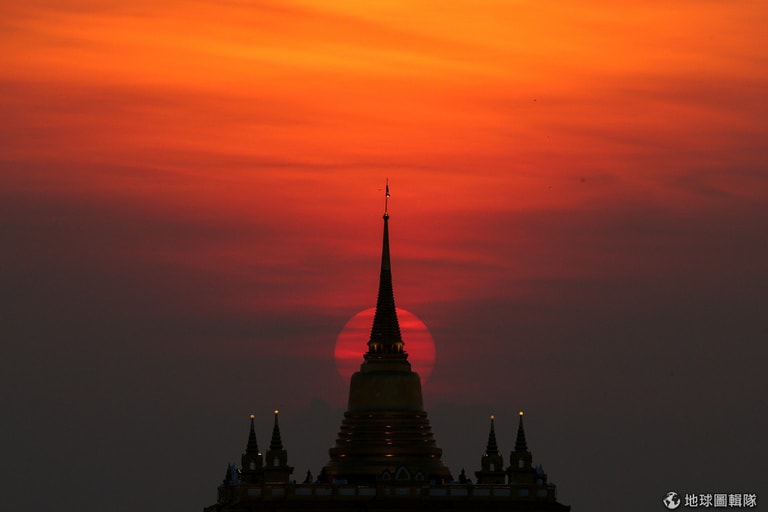 在曼谷金山寺,紅通通的夕陽正緩緩沉下地平線,留下了一幅令人屏息的美景。