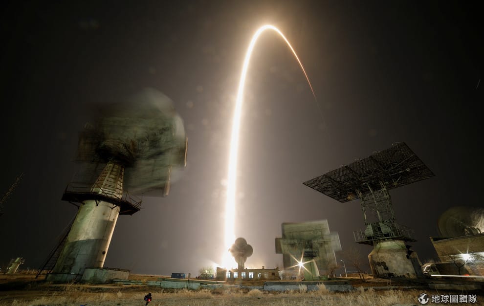 在拜科努爾太空發射場(Baikonur Cosmodrome),載著太空人前往國際太空站(International Space Station)的聯合號(Soyuz)太空船在暗夜中升空。