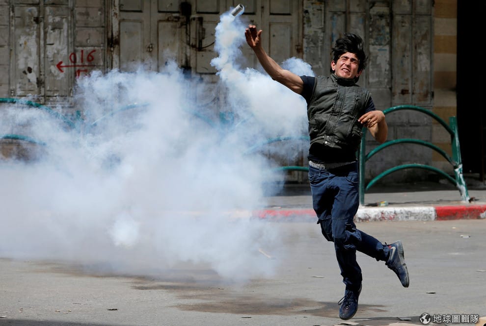 在約旦河西岸的希伯侖市(Hebron),一名巴勒斯坦抗議人士將以色列軍方發射過來的催淚瓦斯丟回去。