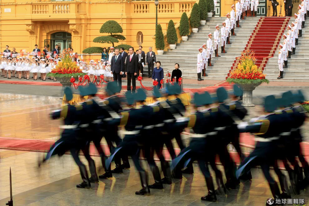 在位於河內的總統府前,遠道而來的南韓總統文在寅和越南領導人陳大光一起檢視儀隊行進。