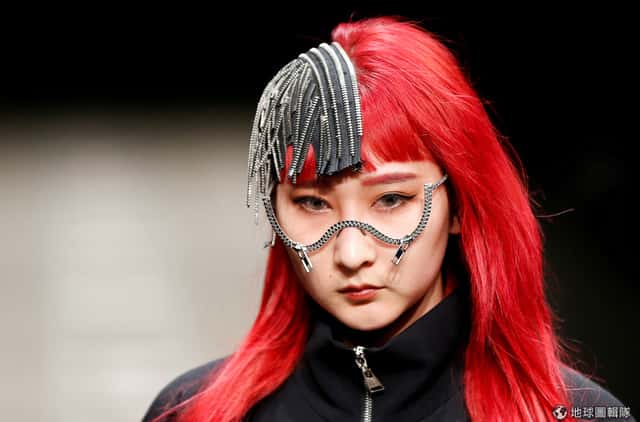 在東京時裝周上,一名紅髮模特兒頂著設計師CHANU的拉鍊造型上台走秀,為品牌ACUOD宣傳。