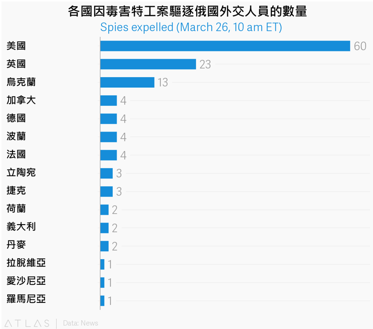 目前以英國來說,他們已經驅逐了 23名俄國外交人員。作為報復,俄國也驅逐了同樣數量的英國外交人員。