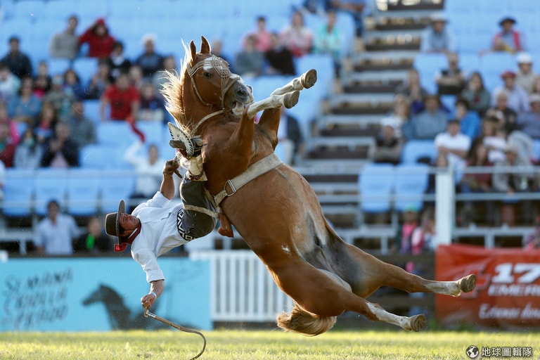 在首都蒙特維多(Montevideo),一匹野馬硬是把騎在身上的高喬人(Gaucho)給抖下來。高喬人分布於烏拉圭、阿根廷、智利和巴西,他們是天生的馬術好手,以勇敢和狂放不羈為人所知,通常以放牧和打獵維生。