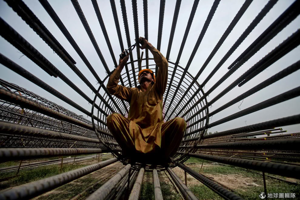在鄰近阿富汗邊境的白沙瓦市(Peshawar),一名工人拿著工具在固定鋼條。