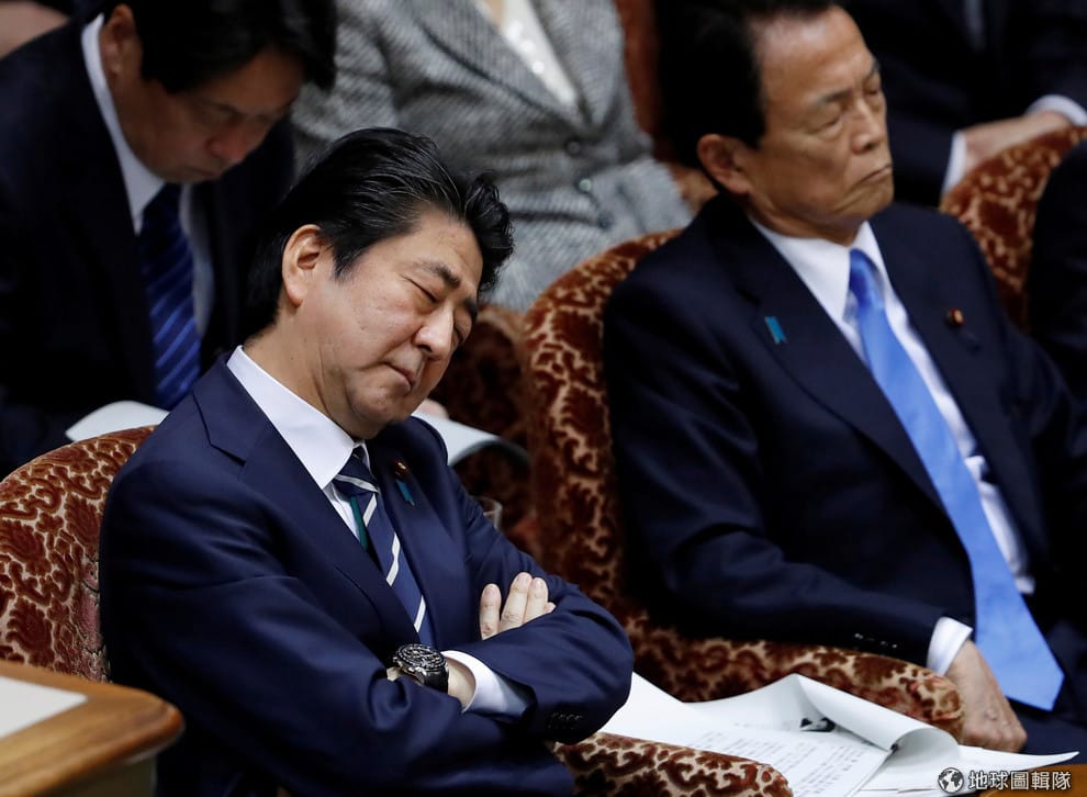 28號這天,日本首相安倍晉三在參議院開會時閉目養神,他的身旁坐著財務大臣麻生太郎。