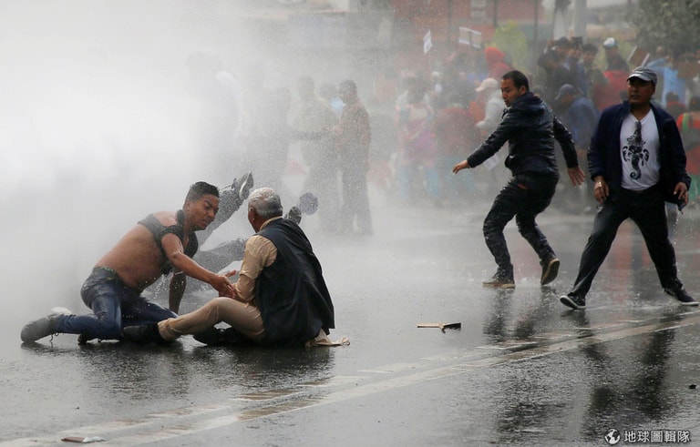 在加德滿都(Kathmandu)的街頭,當局出動了水車來驅散示威民眾,這些民眾無法接受政府的道路擴張計畫,認為這項計畫會讓他們失去家園,憤而決定上街抗議。