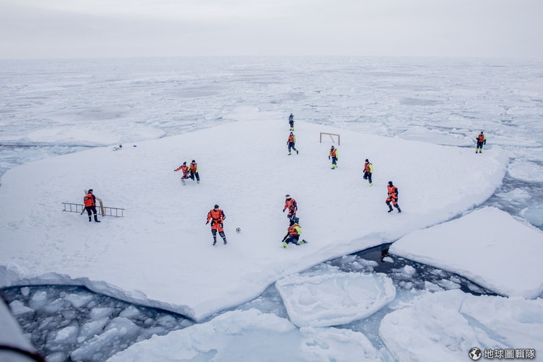 來自挪威的科學家和海軍在北極海的浮冰上踢足球,替冰天雪地的生活增加一點趣味。