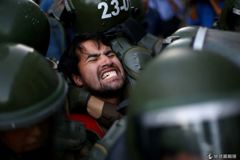 在首都聖地亞哥(Santiago)的街頭,全副武裝的鎮暴警察把一名示威民眾給架走,希望那些在街上抗議教育商品化的民眾可以離開。