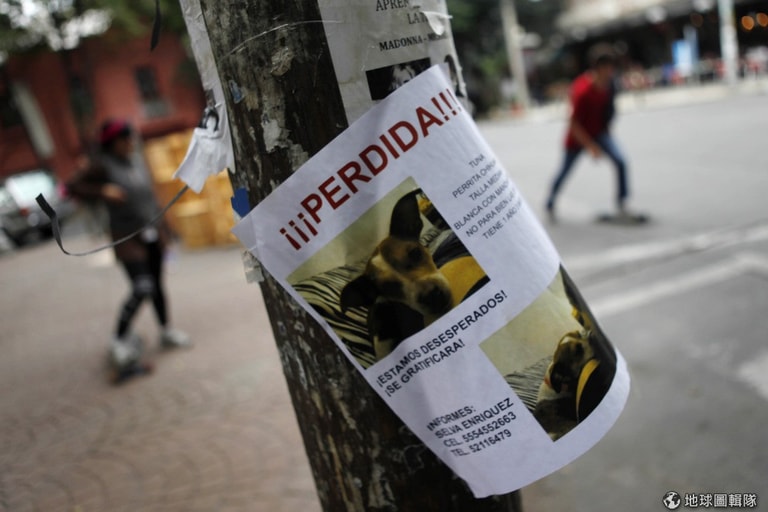 墨西哥當地的公共公園內,一張尋犬啟事貼在柱子上